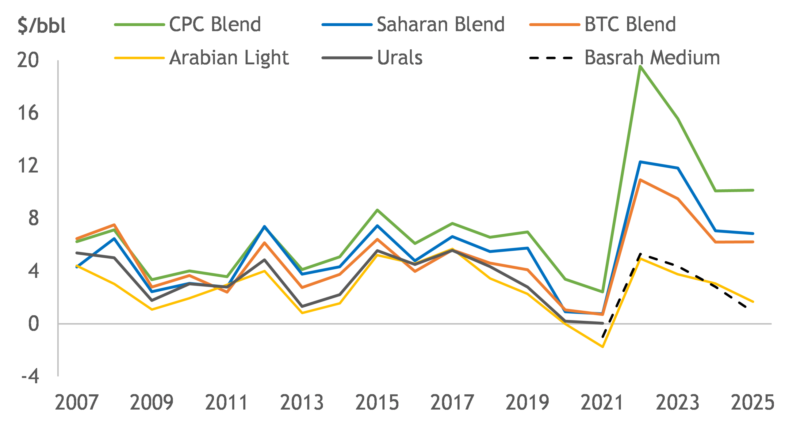 Since March 2022, Urals has no longer been available. The refining margins with BTC Blend and the other light crudes reached historical highs. The same would have been seen with WTI, which is now processed regularly in Europe and is part of the Brent complex. However, Arabian Light and Basrah Medium, which are sold under term agreements and from a quality standpoint are possible replacements for Urals, did not follow the light crudes. The result is that BTC Blend has been offering margins that since 2022 have been on average $3.75/bbl higher than Arabian Light. Very light crudes such as Saharan Blend and CPC Blend have offered even better margins.